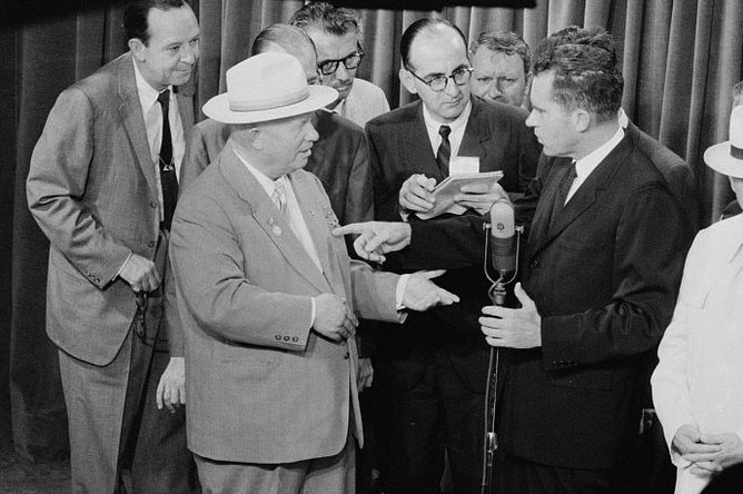 Москва, 24 июля 1959 – Вице-президент Ричард М. Никсон и премьер Никита С. Хрущёв сегодня публично дискутировали о стиральных машинах, капитализме, свободном обмене идеями, встречах в верхах, ракетах и ультиматумах.