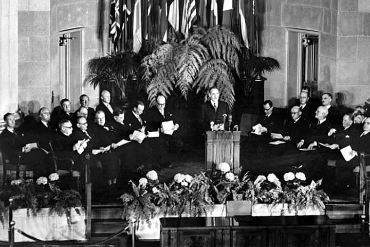 Фултон, Миссури, 5 марта —Здесь сегодня выступил Уинстон Черчилль, пропагандируя братскую ассоциацию между Британской империей и Соединёнными Штатами, чтобы остановить «экспансионистские и прозелитические тенденции» Советского Союза. Представленный президентом Трумэном в Вестминстерском колледже, британский премьер-министр времен войны заявил, что простой баланс сил сегодня в мире был бы слишком незначительным преимуществом только предлагал «искушение для испытания прочности». Он добавил, что англоговорящие народы должны н ... Читать дальше » |
